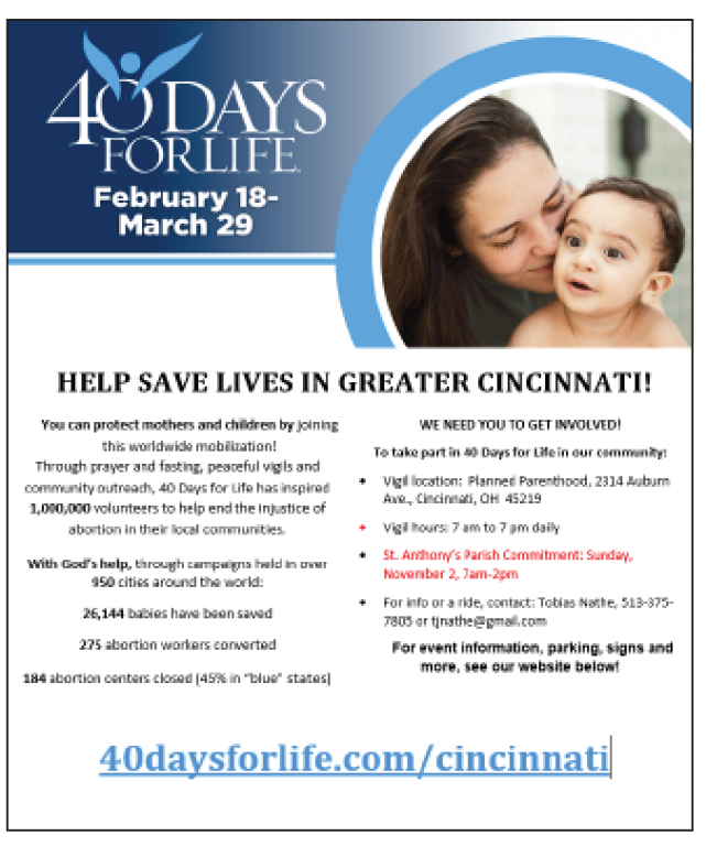 Please join the Pro-Life community in praying for unborn children and their families! Every Saturday, the Helpers of God’s Precious Infants & Mary’s Mantle host Mass at Holy Name Church (2422 Auburn Avenue, Cincinnati, OH) at 8:00 a.m., followed by a prayer vigil for the closing of Planned Parenthood and all those who seek their services. We hope to see you there!