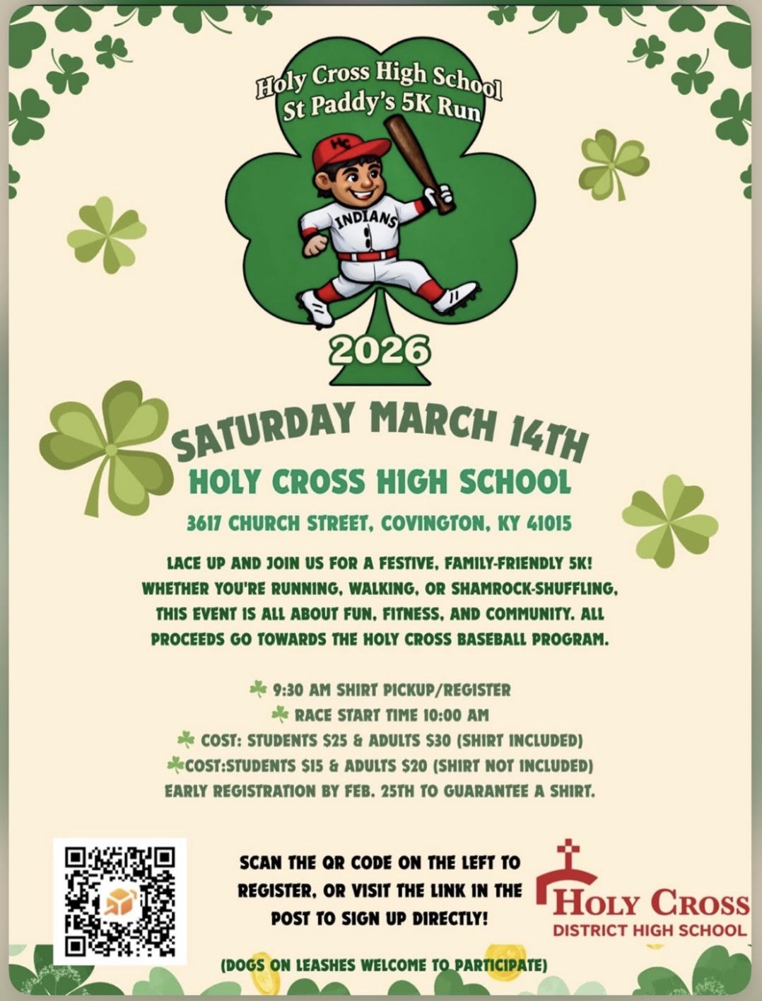 HOLY CROSS BASEBALL 5K RUN - Join our Shamrock Shuffle on Saturday March 14 at Holy Cross High School, rain or shine! Check-in begins at 9:30am. The run begins at 10:00am. All proceeds from the event benefit the Holy Cross Baseball program. Cost is $15 for students, $20 for adults. Wear your green - runners and walkers welcome! See attached!